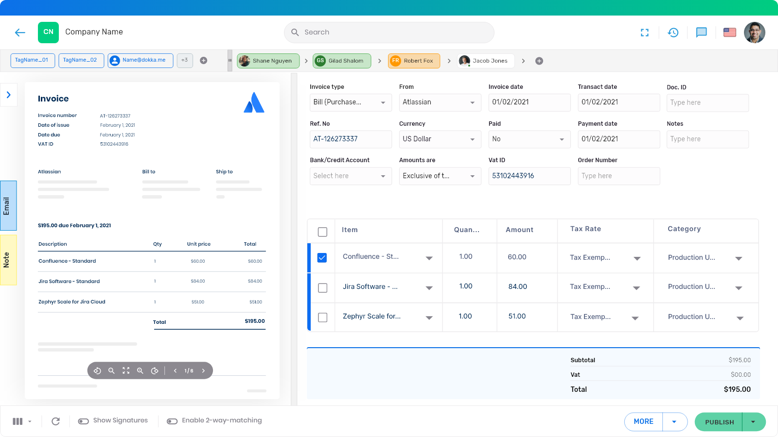 With DOKKA, approvals happen inside a centralized system where approvers see the invoice, supporting documents, and full context in one place—resulting in faster cycle times and fewer approval errors.