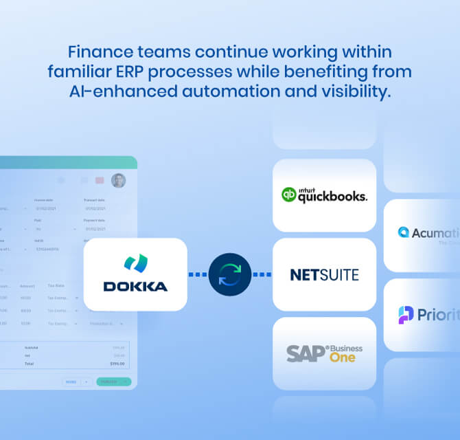 DOKKA integrates natively with leading ERPs, including NetSuite, SAP Business One, Acumatica, QuickBooks, and Priority.