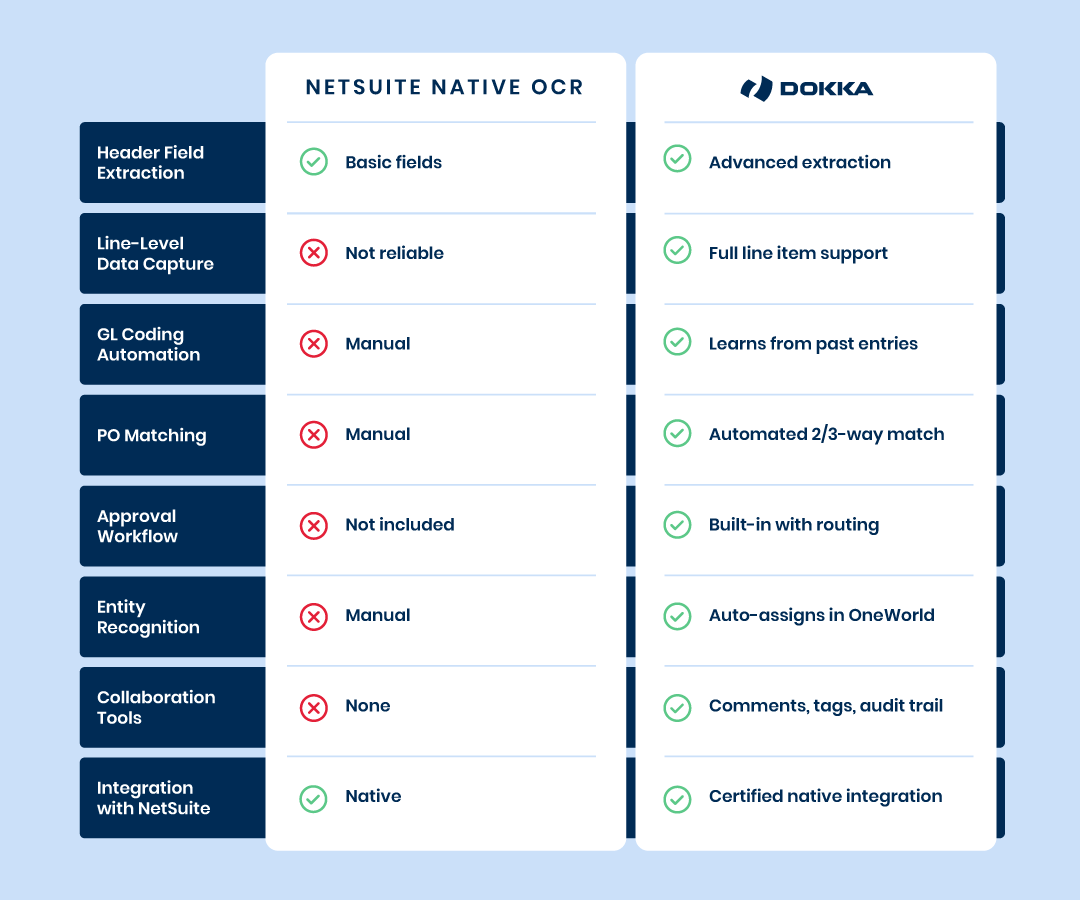 There’s a lot to unpack, so here’s a breakdown of what NetSuite OCR can’t do (or doesn’t do well)—and how tools like DOKKA step in to fill the gaps.